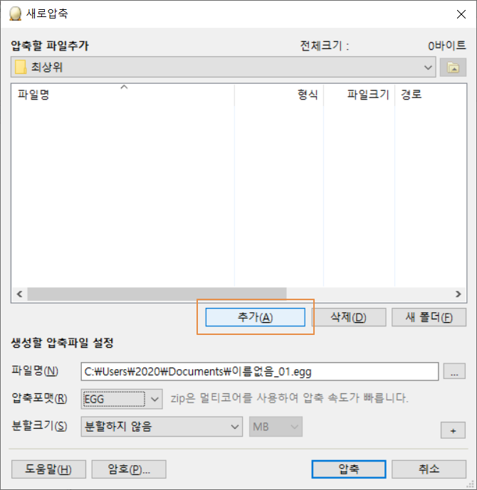 압축할 원본 파일을 추가하기 위해 <추가>를 누릅니다.
