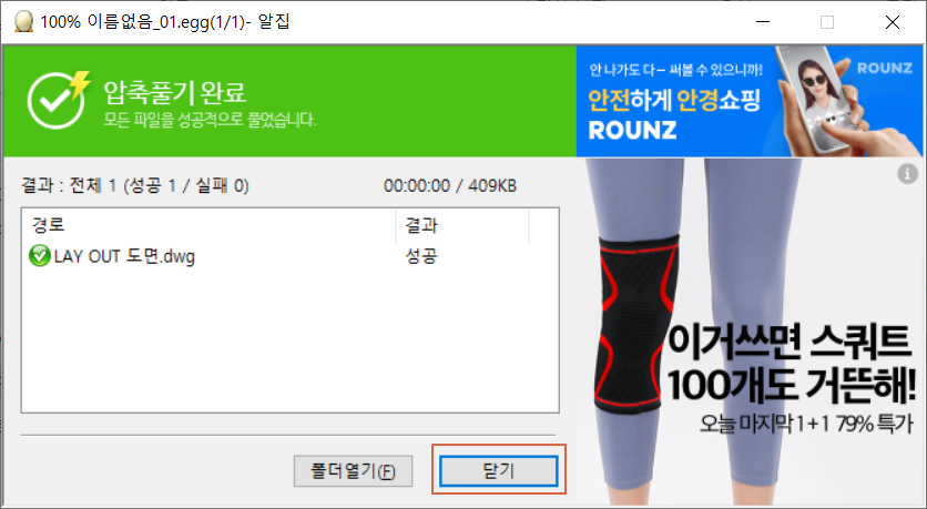 EGG 압축 풀기가 완료되었습니다. <닫기>를 누릅니다.