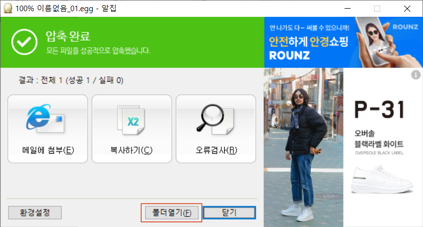 EGG 압축이 완료 되었습니다. <폴더열기>를 선택합니다.