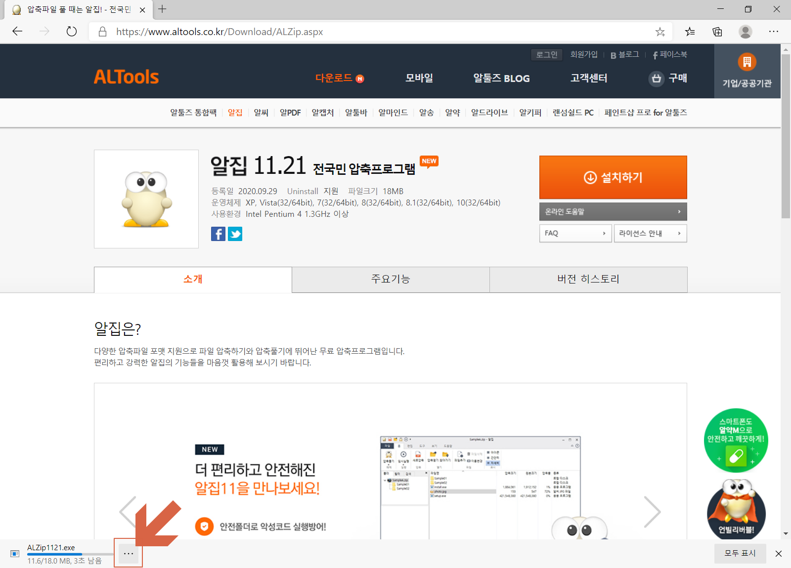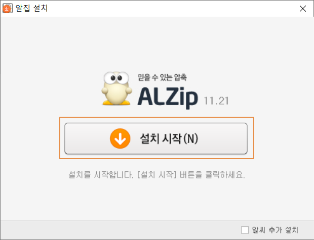 알집 버전이 벌써 11이 넘어갔습니다. 그만큼 안정성 측면에서 유용할 수 있다고 보입니다. <설치하기>를 누릅니다.
