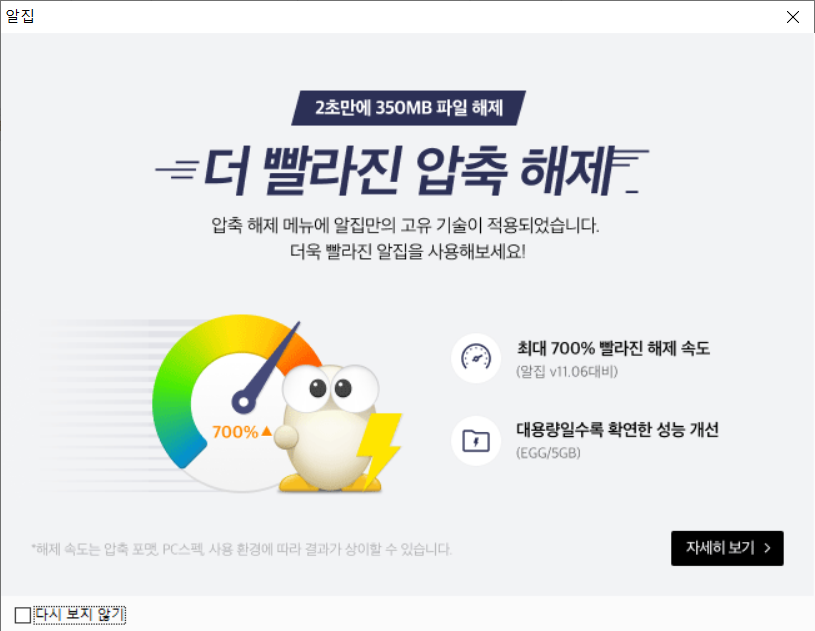 알집을 실행하면 이번 업데이트에 대한 소개가 나오며, 이전 버전에 비해 7배가 빨라졌다고 합니다.