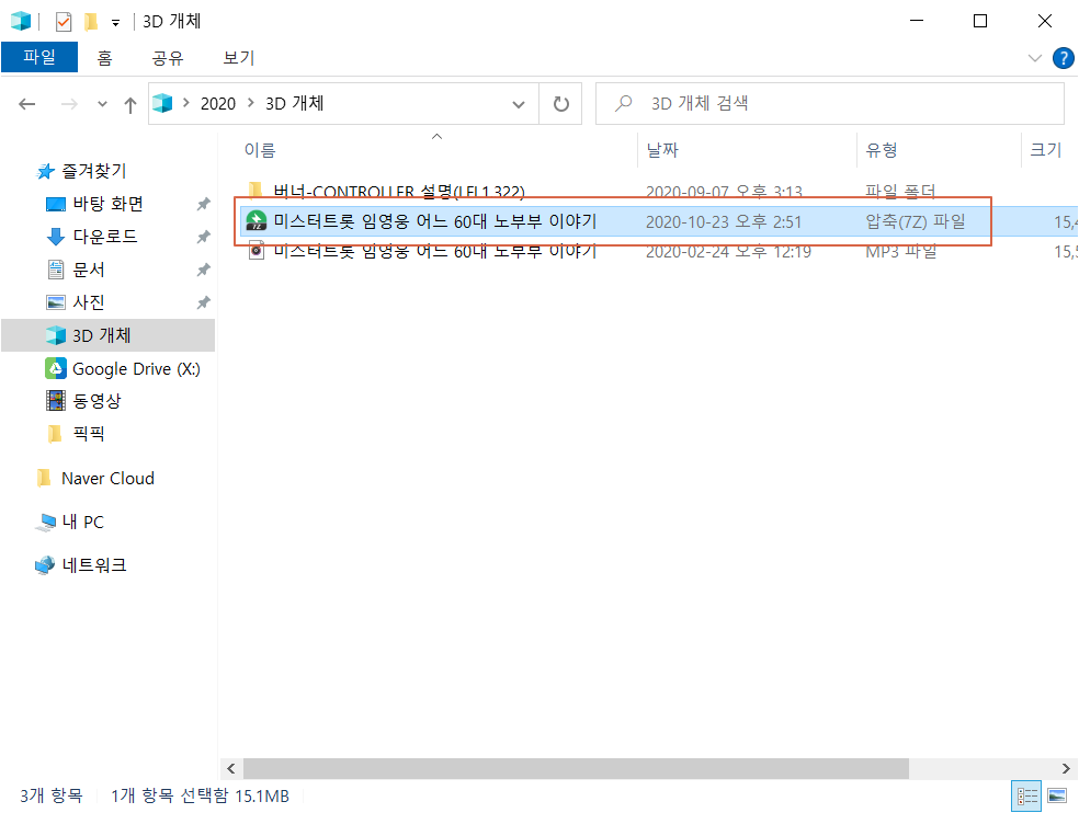 일단 압축할 파일을 준비합니다. 선택된 MP3 파일을 7z 파일로 압축을 하겠습니다.