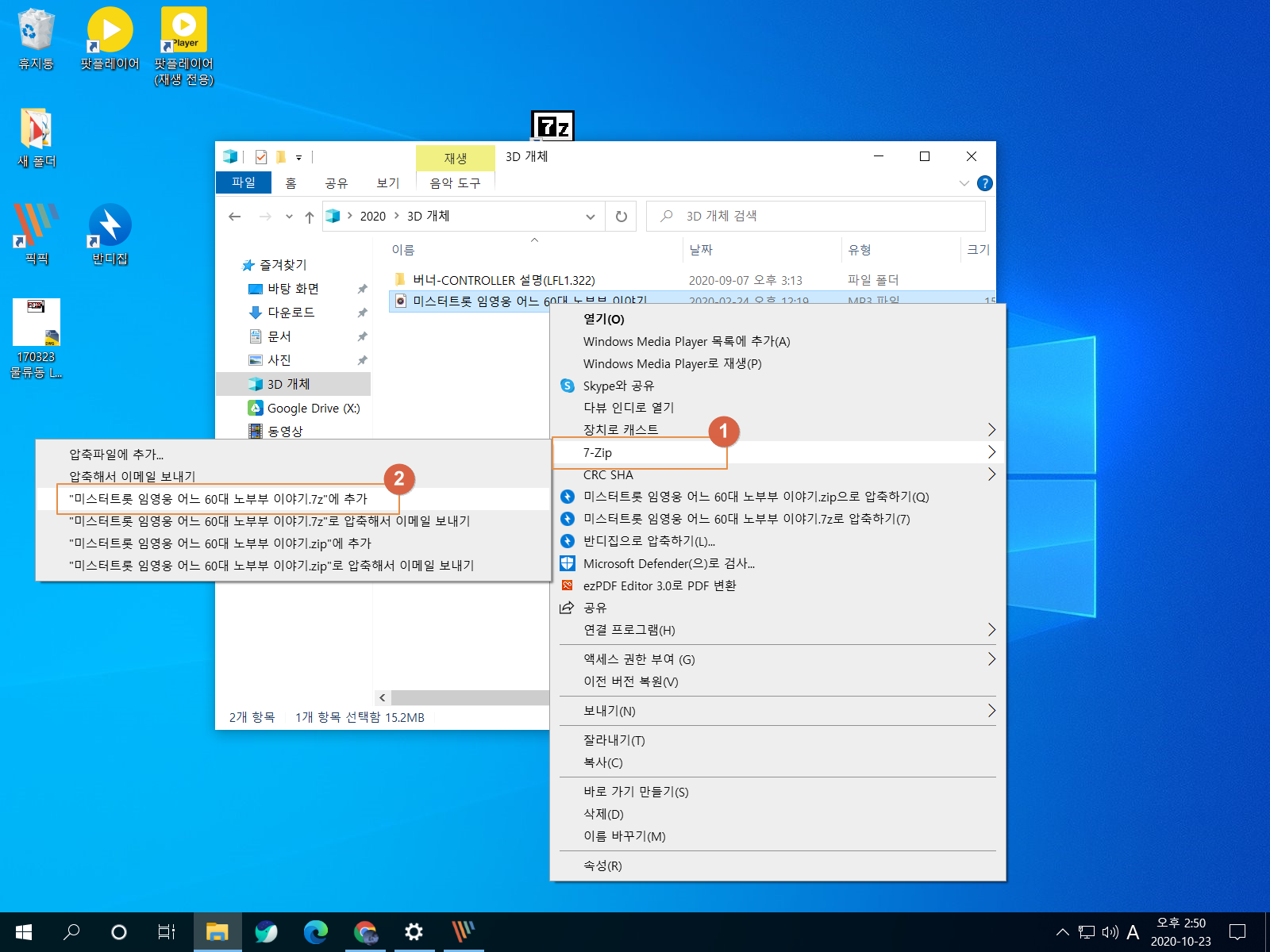 해당 파일을 선택하고 마우스 오른쪽 버튼으로 클릭합니다. 메뉴가 나타나고, <7Zip>에 마우스로 가져가면 추가메뉴가 열리며 <"미스터트롯 어느 60대 노부부 이야기.7z"에 추가>를 선택합니다.
