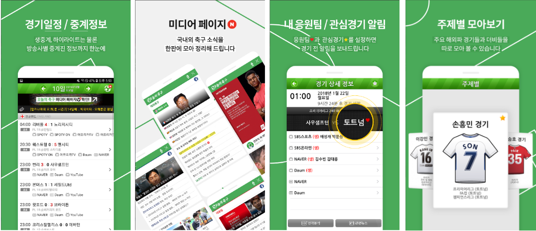 매일매일 그날의 경기들을 국가별 / 리그별 / 팀별로 살펴볼 수 있으며, 해외 리그에서 활약중인 주요 한국 선수들의 일정도 주제별 화면에서 따로 모아볼 수 있습니다.