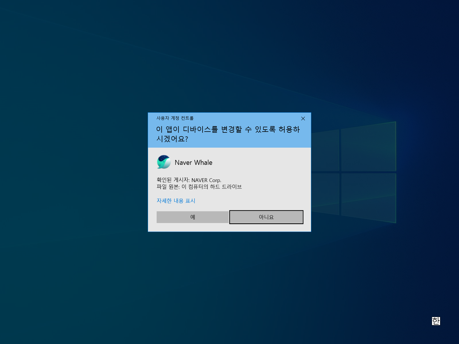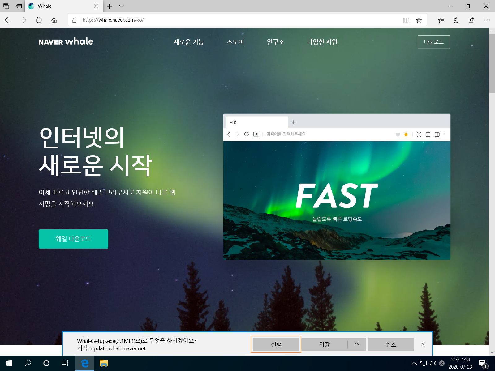 <실행>을 누르면 자동으로 다운로드하여 네이버 웨일 설치 프로그램이 실행됩니다.