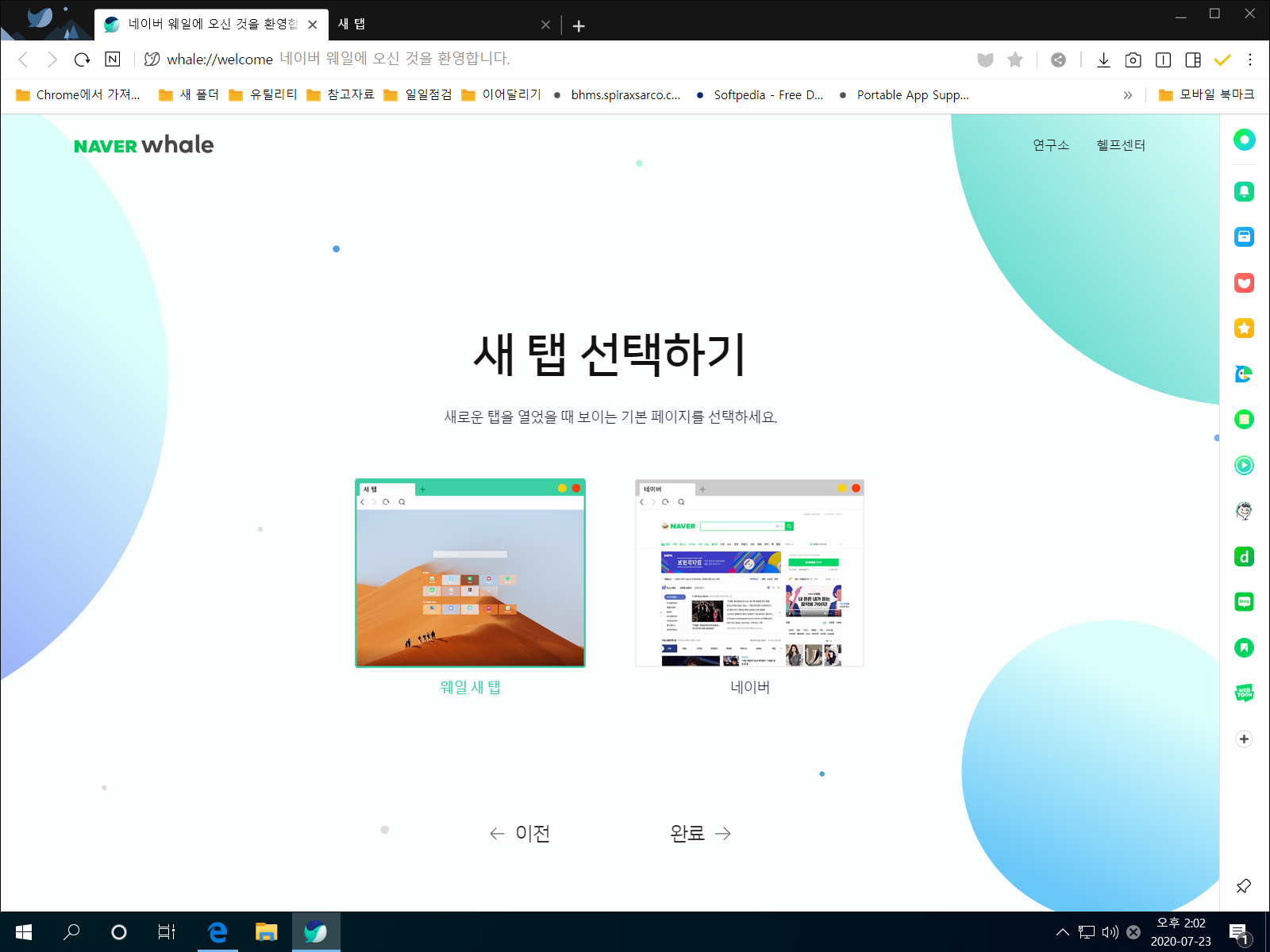 여기서는 웨일을 실행하였을 때 모습을 선택합니다. 구글 검색처럼 단순하거나 혹은 기존 네이버 홈페이지를 보여주거나 하는 선택을 하신 후 <완료>를 누릅니다.