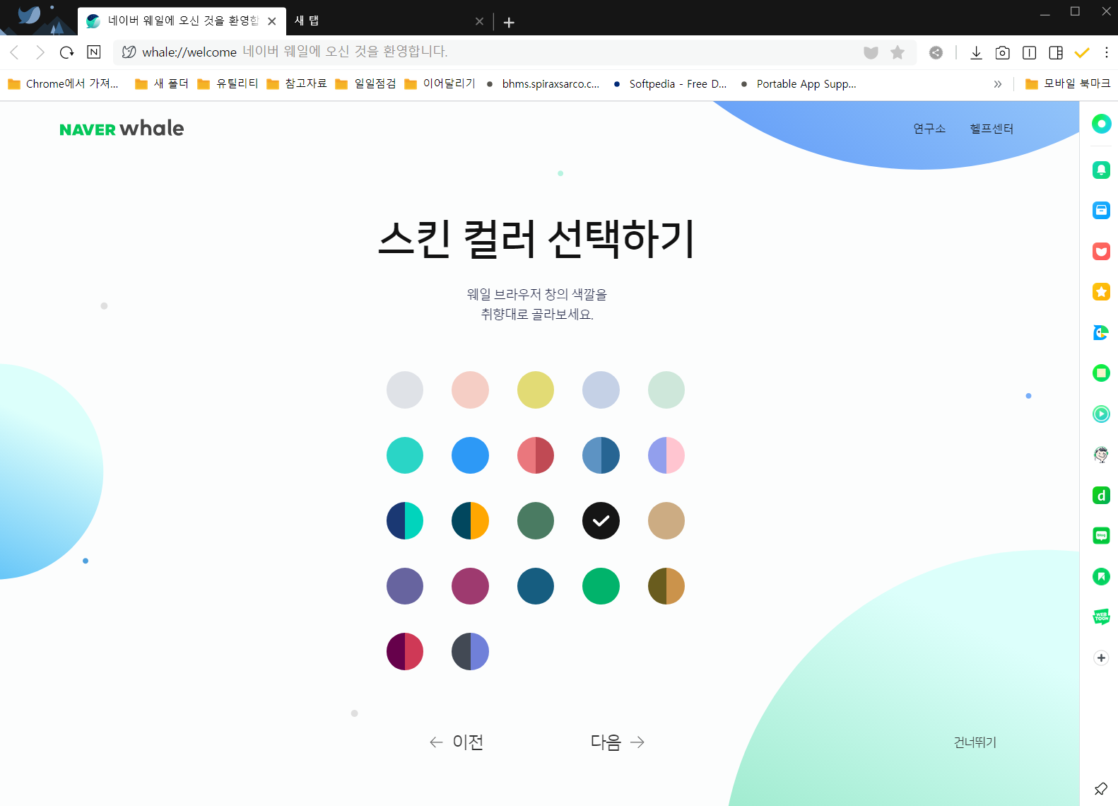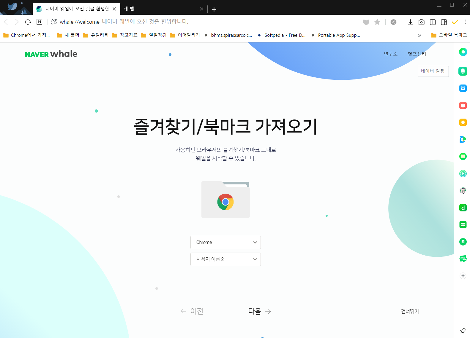 이미 설치된 구글 크롬 브라우저의 북마크를 가져올 수 있습니다. 필요 없으시다면 건너뛰기하시면 됩니다. 이후에 다시 불러오기도 가능하므로 나중에 선택하셔도 가능합니다.