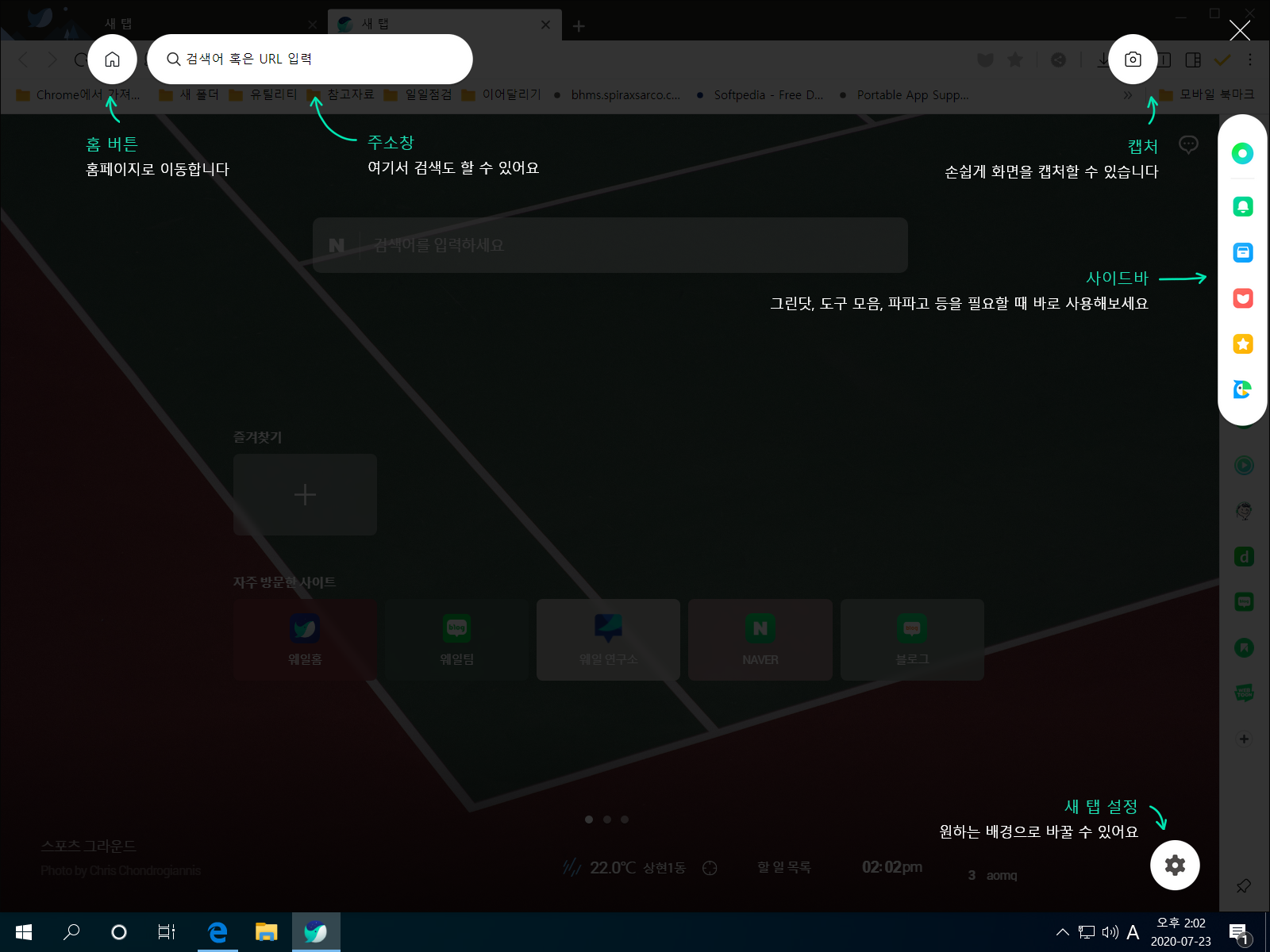 당연히 네이버 서비스에 접근이 쉽게 설계되어있으며, 사이드 바에 마치 윈도우 작업 표시줄 같은 느낌으로 번역이나 메모, 네이버 KEEP 등 다양한 기능을 빠르게 접근하여 사용할 수 있도록 되어 있어 상당히 편리합니다.