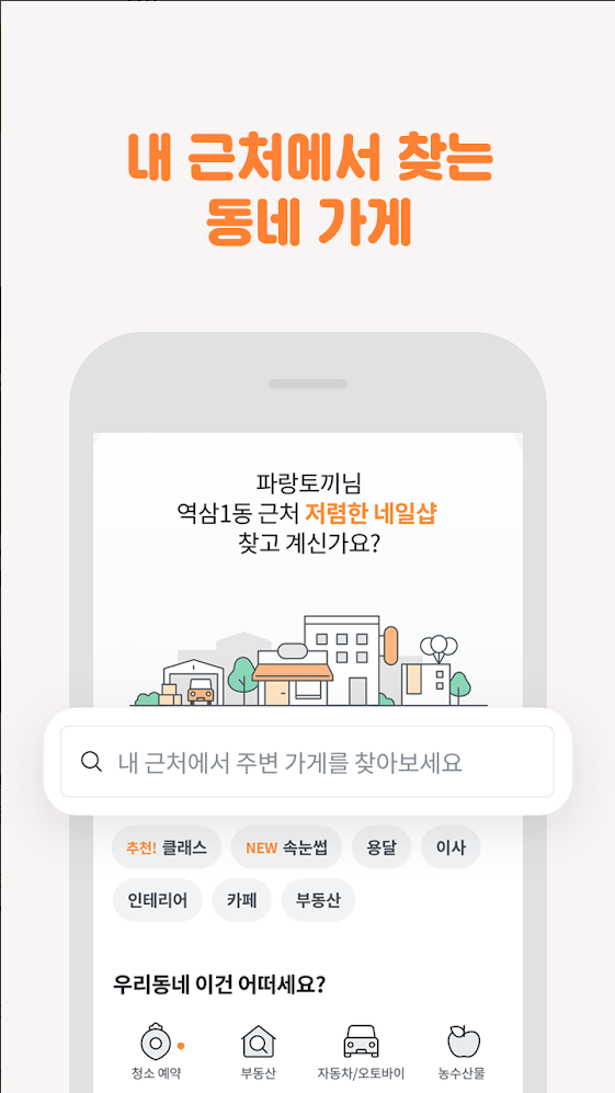 내 근처 가게 정보가 궁금할 때 손쉽게 찾을 수 있어요. 우리 동네 이웃들의 추천 후기를 확인하고 동네 곳곳의 가게들을 찾아보고 이용할 수 있어요.