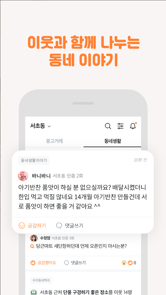 과거의 벼룩시장, 교차로 등의 지역신문같은 느낌이 강한 온라인 커뮤니티라고 볼 수 있으며, 이를 통해 동네 주민들과 가깝고 따뜻한 생활을 만들어 갈 수 있습니다.