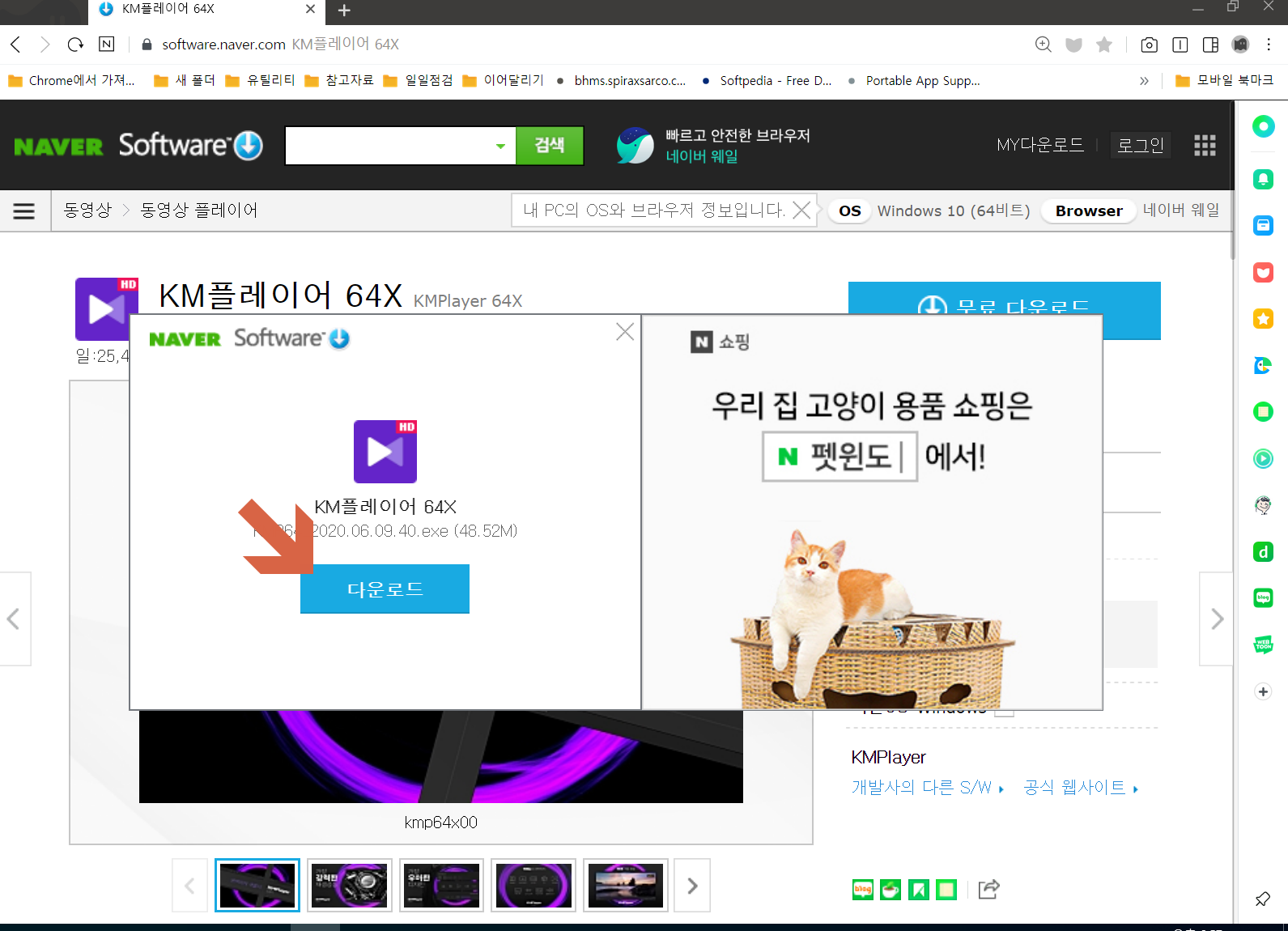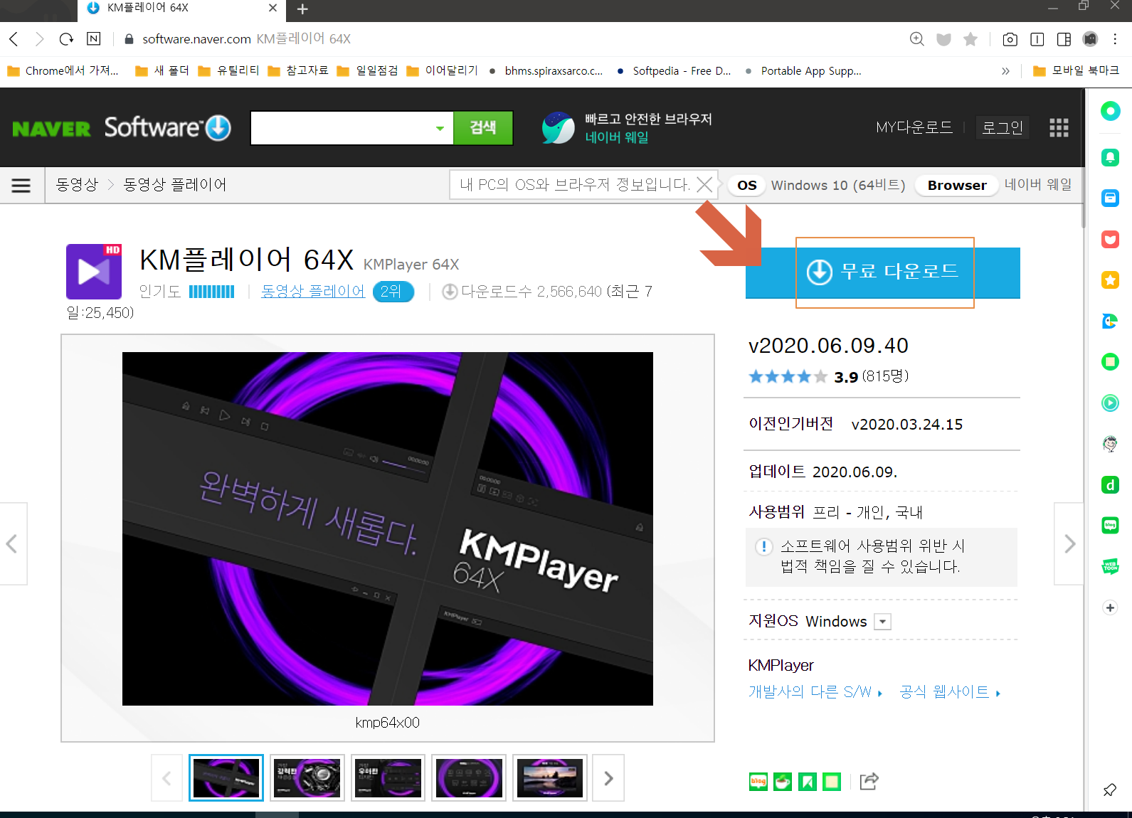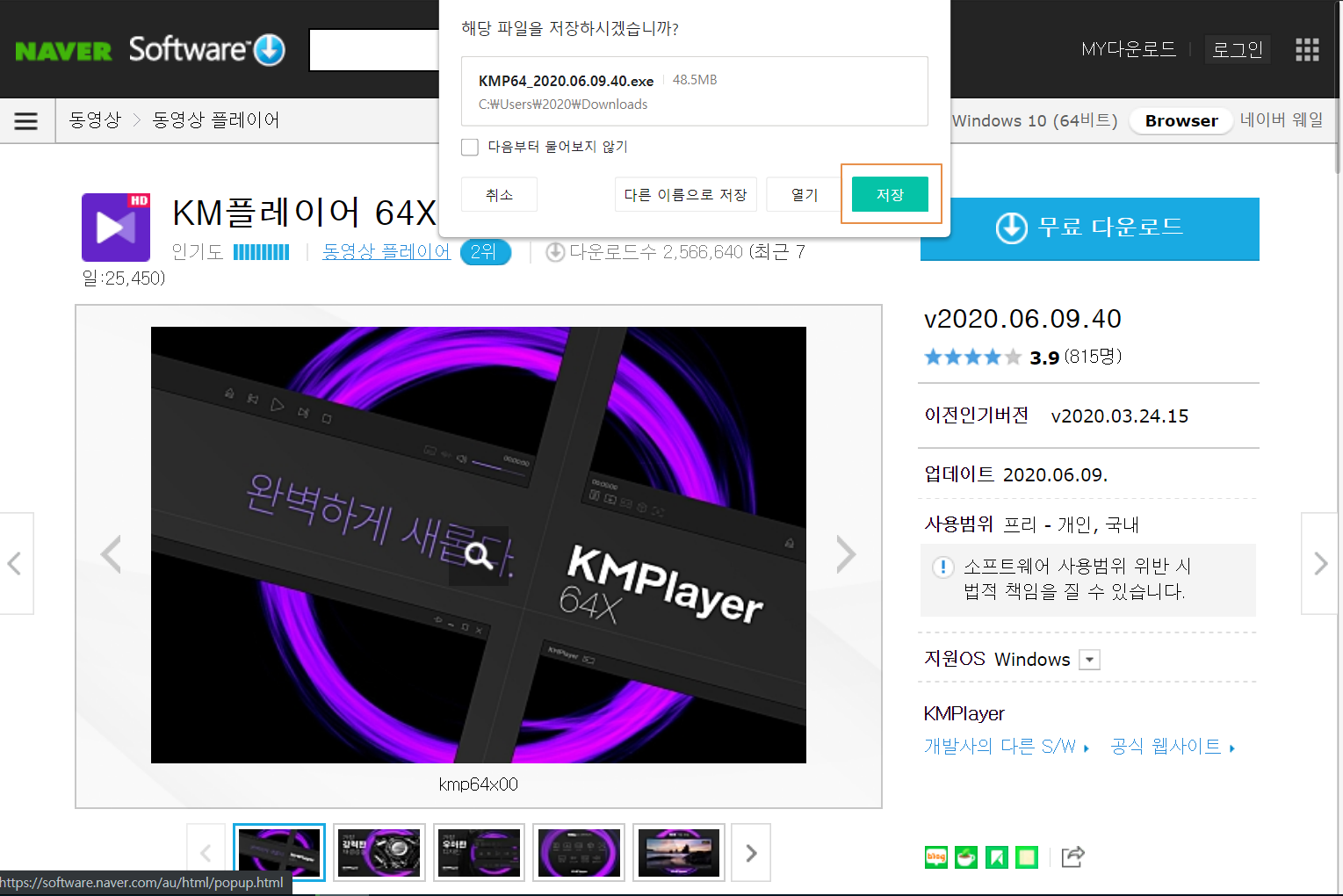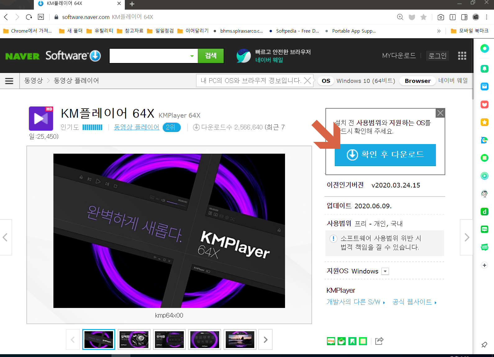 네이버 소프트웨어의 KM플레이어 64X 다운로드페이지로 접속합니다.
