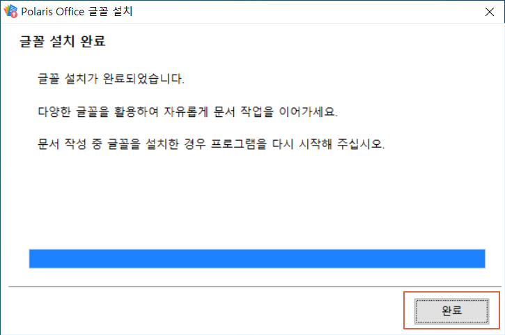 * 만약 저장 공간이 부족하시다면 <글꼴 추가 설치하기>는 체크해제하고 완료를 누르셔도 됩니다.