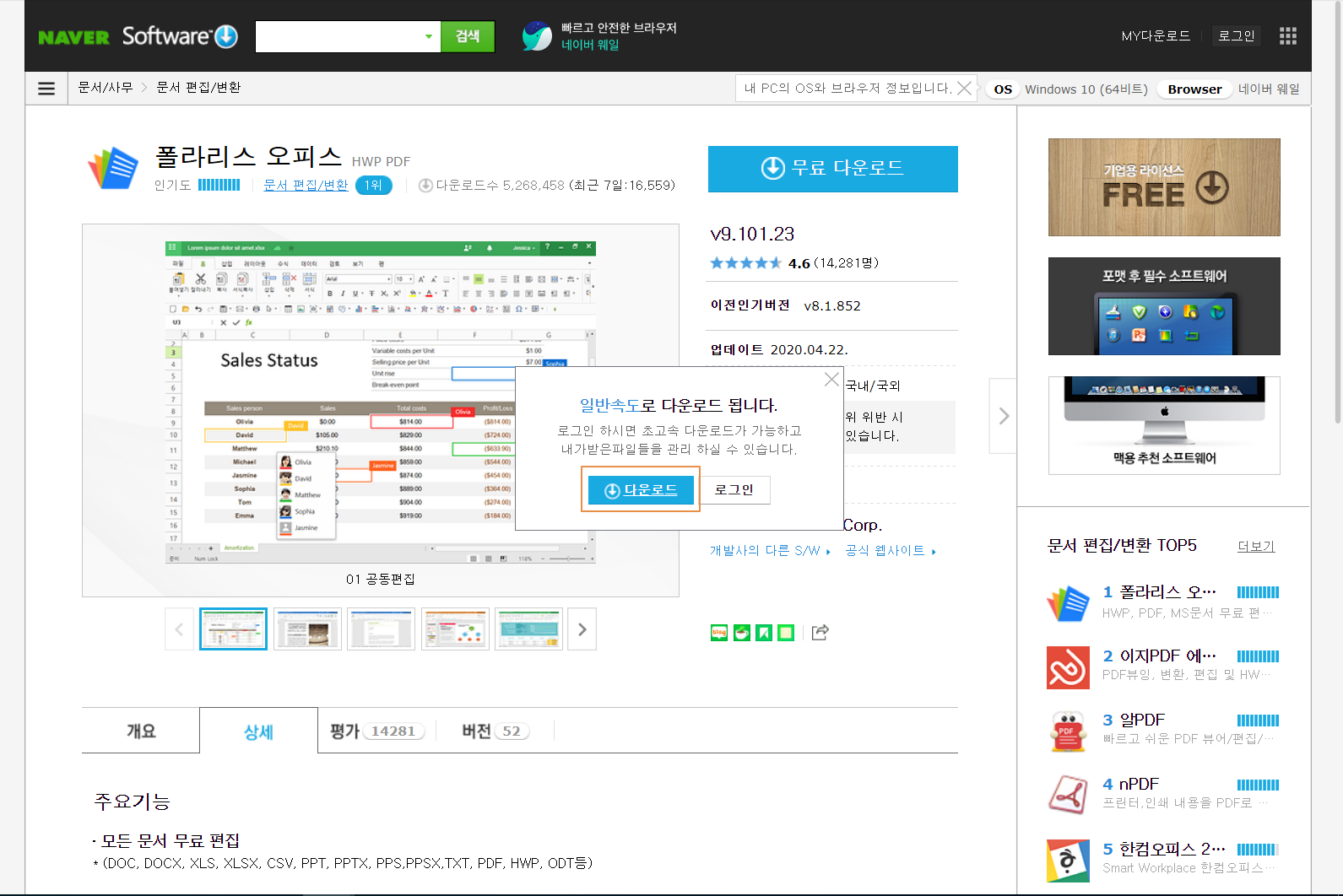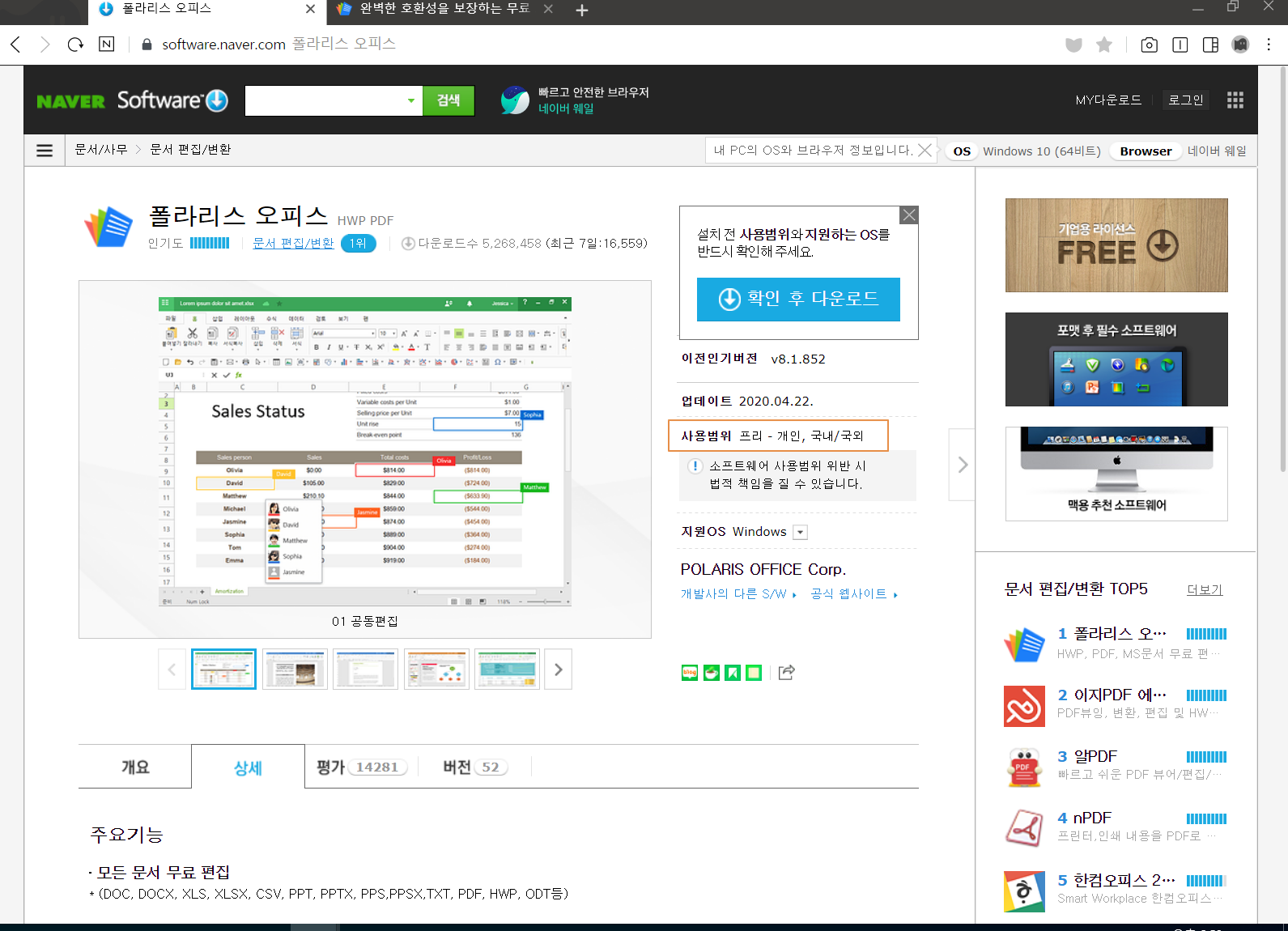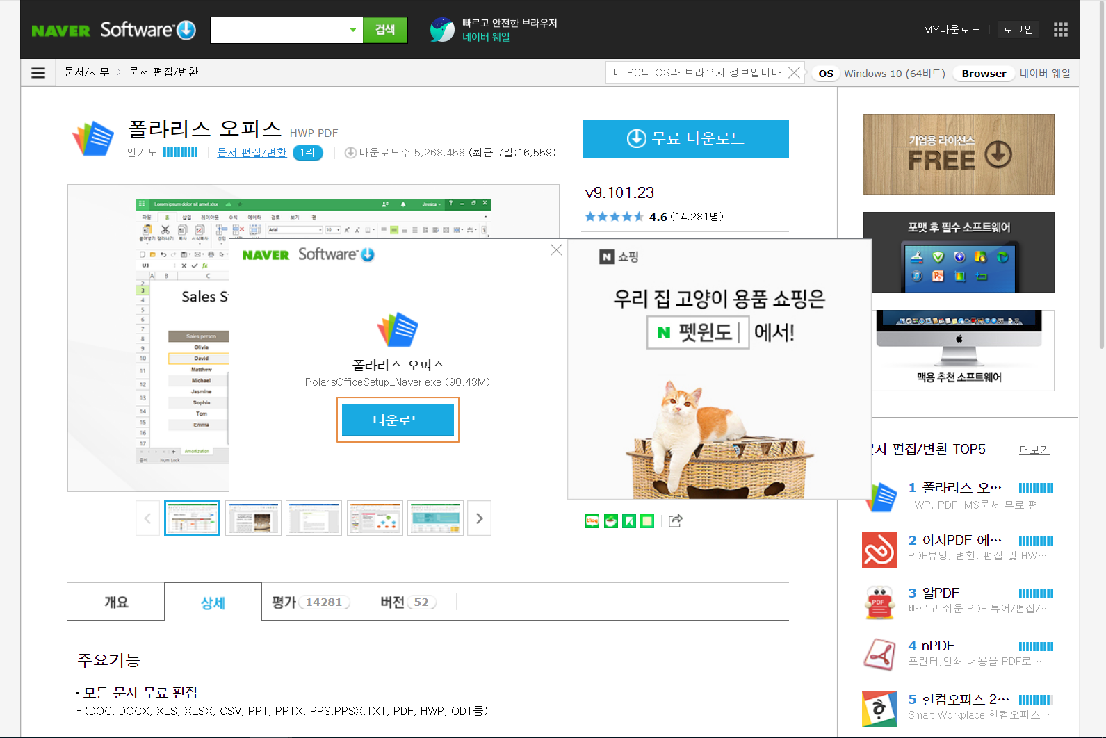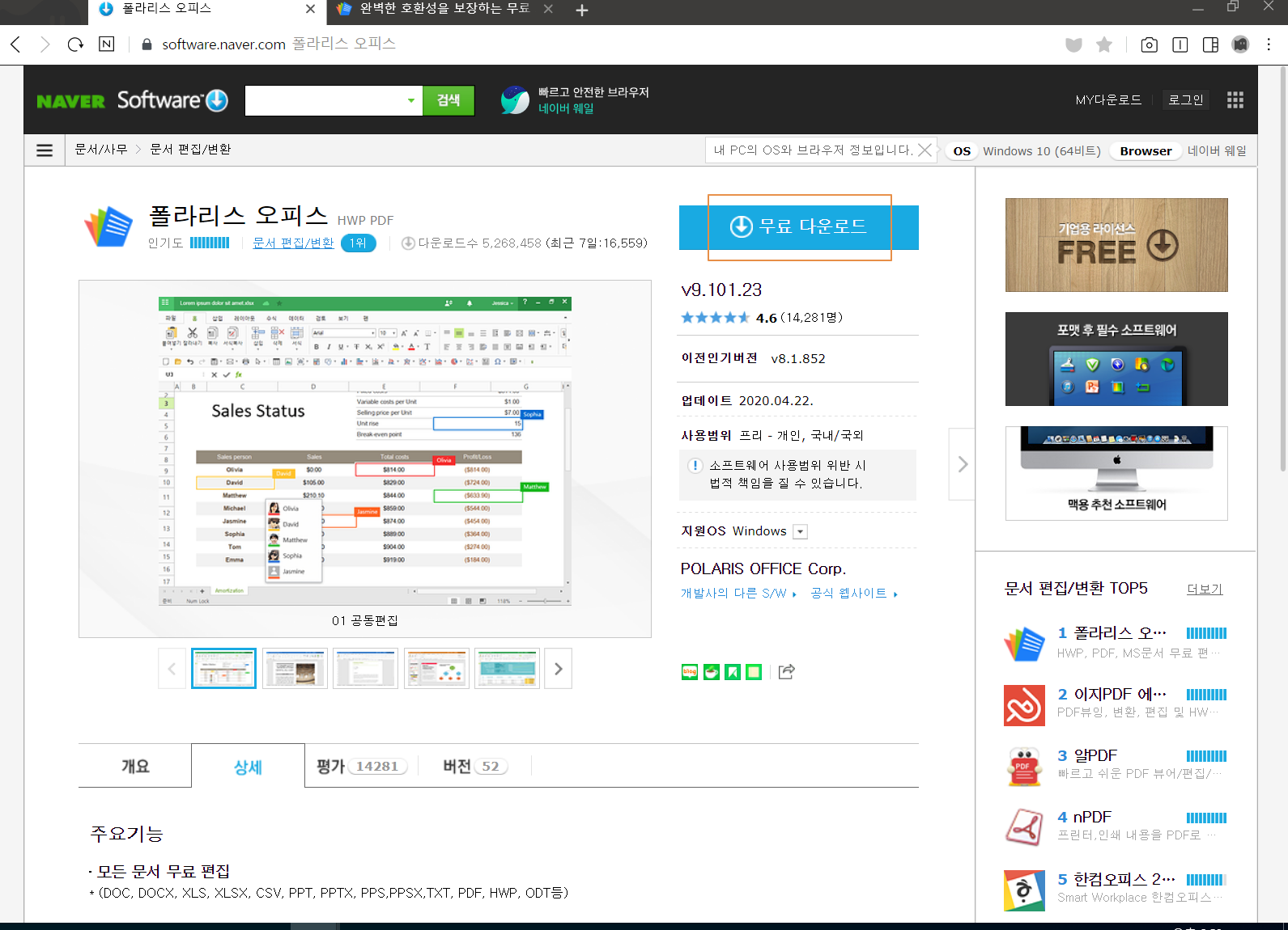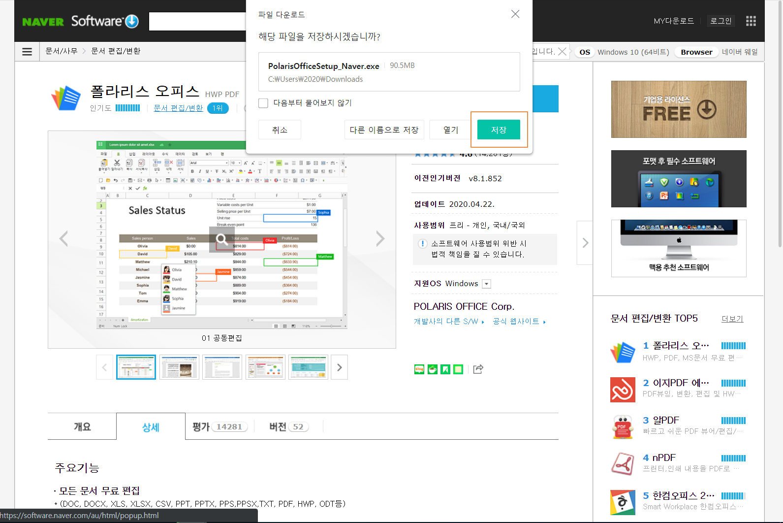 네이버 소프트웨어 자료실로 이동하여 폴라리스 오피스(Polaris Office) 다운로드 페이지로 접속합니다.